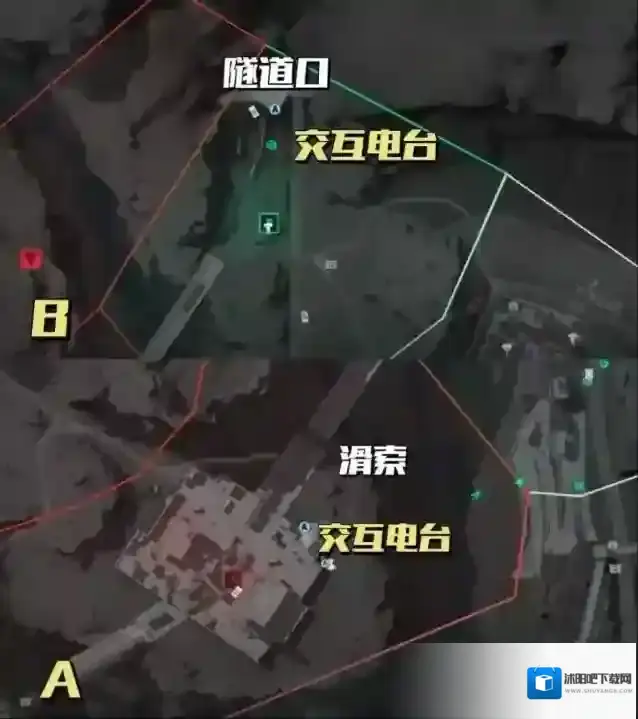 B区域的电台点位非常容易找到,来到地图最上方的隧道口的右侧角落就能找到;A区域的电台需要我们来到悬崖边缘,找到滑索并滑下去进入山洞–此时我们只需要一直走看到一个非常突兀的集装箱和铁网布置的区域,在内部一个比较矮的集装箱上就能找到电台进行交互了。