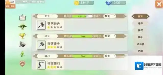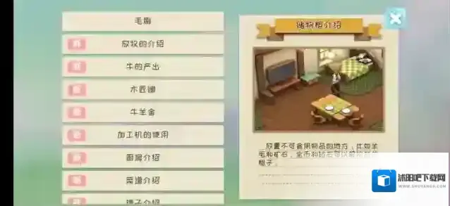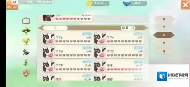 家计薄可以看自己的各种资源(动物数量、材料数量、饲料数量等);奖杯标志是成就;锤子标志是工具状况,可升级工具的使用经验也会显示;动物脚底标志可以看所有动物的健康状态和好感度。