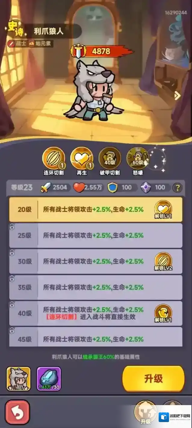 利爪狼人较难获得,一技能造成多段范围伤害,二技能有再生效果,回复最大生命值百分之12,等级高了能抗能打,但抗伤比起凯伦要差许多,狼人主要是伤害极高,在战士职业中伤害排名第一,另外狼人一三技能联动,可以让一技能打出伤害的同时加上破甲效果,属史诗上品。