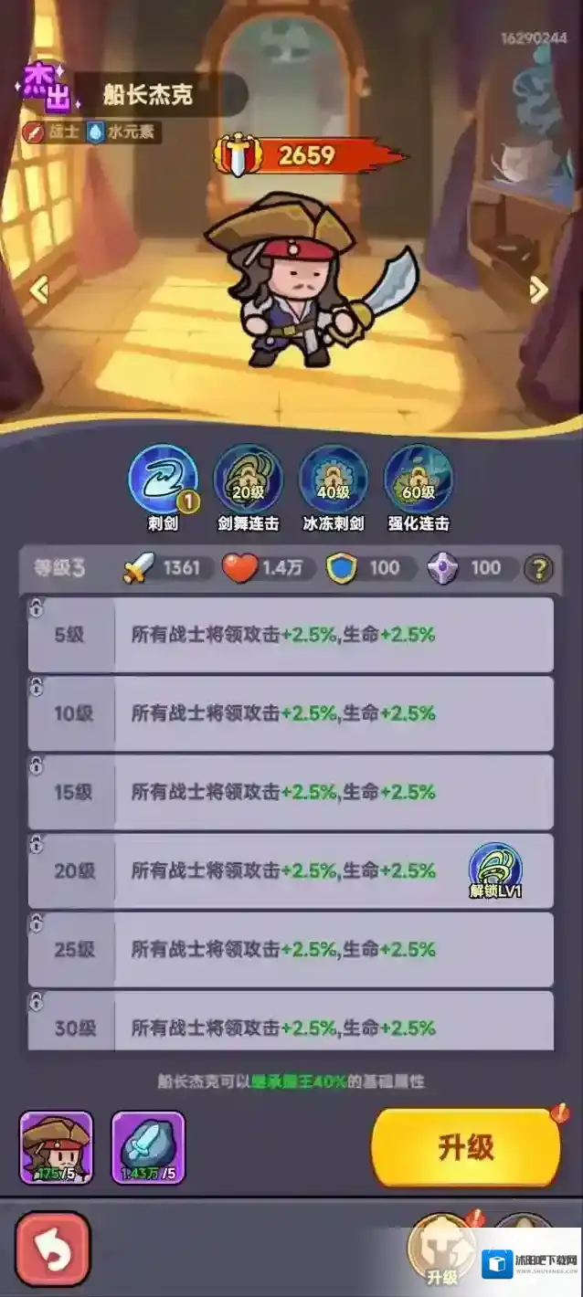 船长杰克,15关之后需要的英雄,船长的一二技能强度不高,第三个技能能让一技能觉醒,并且打出冰冻效果,让目标无法移动3秒,打BOSS有优势且关键,走点位能耗死,属杰出中品。