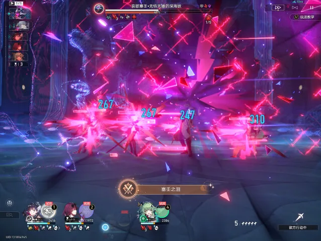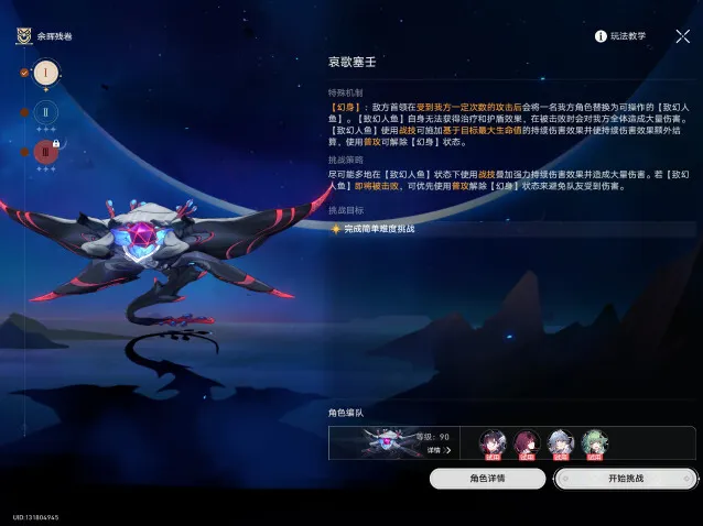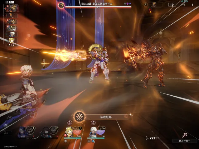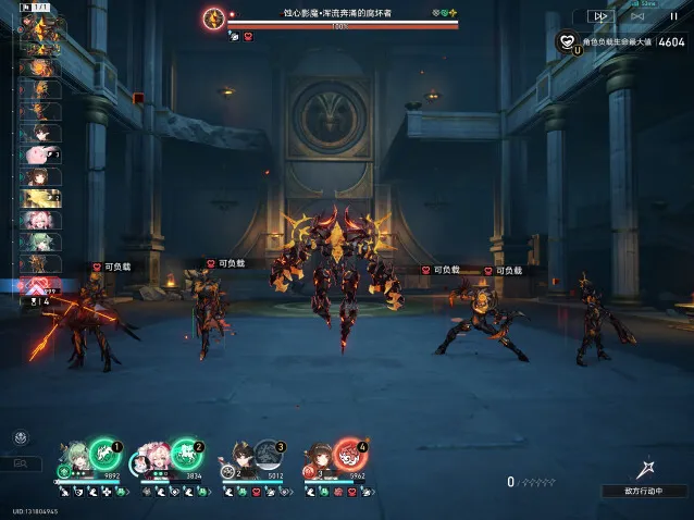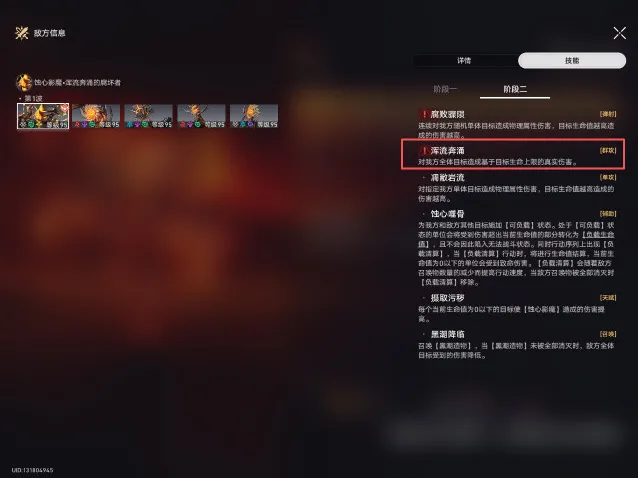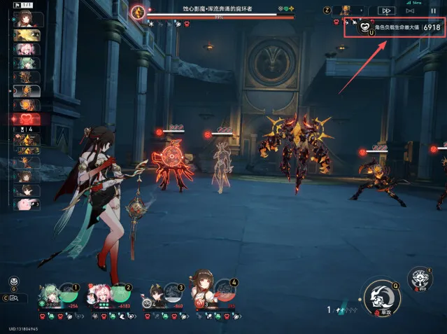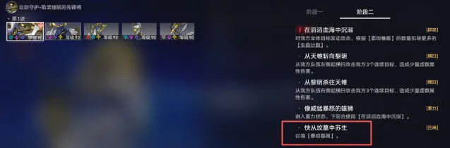 4、一阶段转二阶段BOSS新增一个大招(浑流奔涌),留生存位大招(风堇、灵砂、腾荒、白露等),在BOSS第一次攻击之后,释放大招浑流奔涌之前插队治疗避免角色[负载生命值]超过10000(成就需要8000以内)