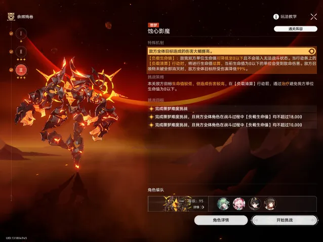 在与「蚀心影魔」噩梦难度的战斗中,我方全体角色[负载生命值]均不超过8000并通关。