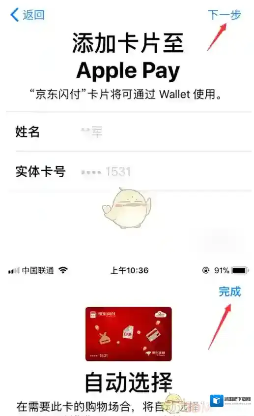 8.点击下一步,然后选择是否自动选择京东闪付进行apple pay支付