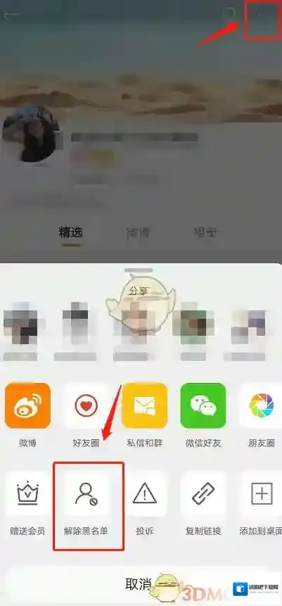 5、或者用户们可以直接搜索微博用户进入屏蔽用户户主页,点击右上方…也能解除黑名单。