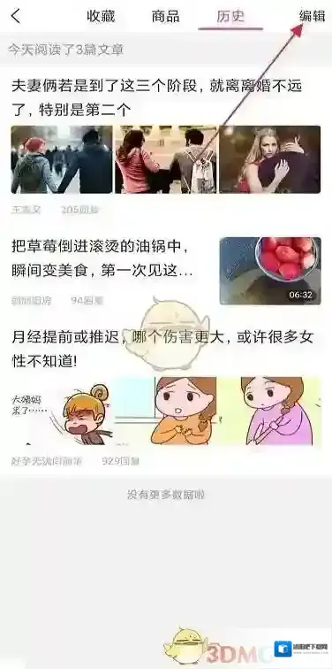 4、进入历史后,点击右上角编辑。