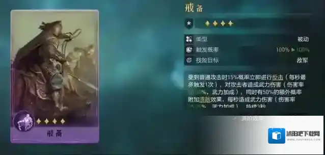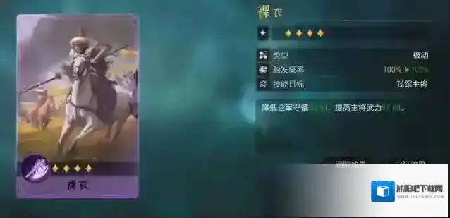 以降低全队守备的代价提高主将武力,简单直白,没什么太大的亮点,适合仅靠主将输出的二保一阵容,如魏兰+秦叔宝+尉迟恭,不过这个技能要慎用,毕竟魏兰剑本身就很脆,带上以后就更脆了。08 借势威吓
