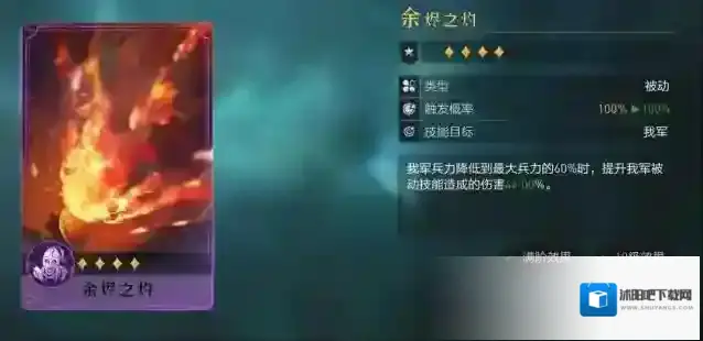 到了后期阶段,前排阵容除打野之外几乎都得同时面对两队以上敌人,因此大部分情况下苦肉触发仅需6秒!135%的回复率看似不高,但实际受武力和守备双加成,回复量极为可观!而固本依据回复增加全体守备,他正好有个6秒的内置CD,完美契合苦肉在面对多名敌人的战斗场景,达到50%的覆盖率,并且他所增加的守备,又能反哺到苦肉,使之回复量更高。推荐英雄弗德里希,尤其是在搭配了穆桂英情况下,能把固本效果发挥到极致,穆桂英可以获得其他队友60%的属性提升,(90+90)×60%=108的额外加成!最终该技能触发的收益变成90+90+90+108=378点守备!哪怕它只有50%的覆盖率,那除以2相当于189点守备全覆盖,一个四星技能而已,还要什么自行车。04 余烬之灼