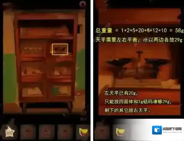 9、由于柜子右边天平需要左右平衡,我们在左边放四面体和1g砝码,右边放2g砝码、5g砝码、球体以及正方体,完成解密获得奖状碎片、胶水。