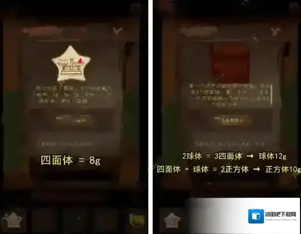 8、我们从五角星信纸得到四面体8g,再看柜子左侧天平,获得球体12g,正方体10g。