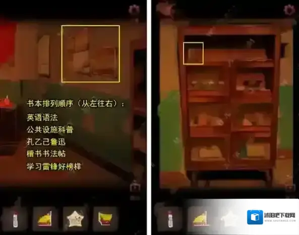10、我们点击墙上奖状,再点击柜子书本,奖状箭头代表排序,每个奖状有对应书名字,结合线索我们调整书本位置即可获得奖状碎片。