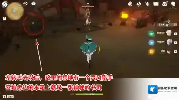 过去以后可以看到这里的镀金旅团营地有一个3.1版本的新敌人–灵风猎手。在他旁边的木箱上就是残页4。