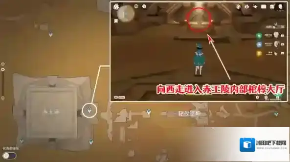 传送到赤王陵图示位置的传送锚点,视角向西,直走进入赤王陵内部放着棺椁的大厅。
