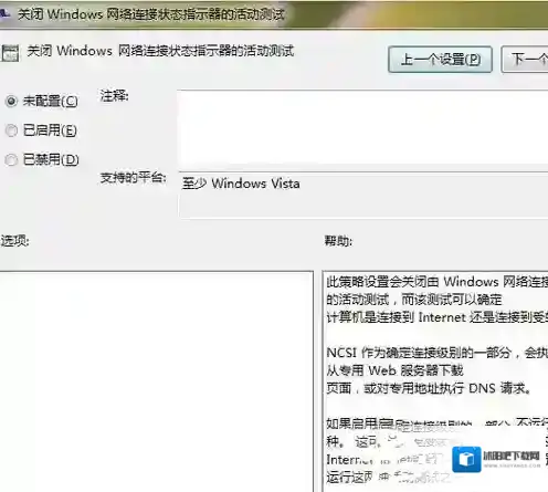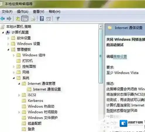 4、然后就是依次展开“计算机配置”、“管理模板”、“系统”和“Internet 通信管理”,然后我们单击“Internet 通信设置”。在列表中找到“关闭 Windows 网络连接状态指示器活动测试”并双击,然后单击“已启用”(默认未配置)。