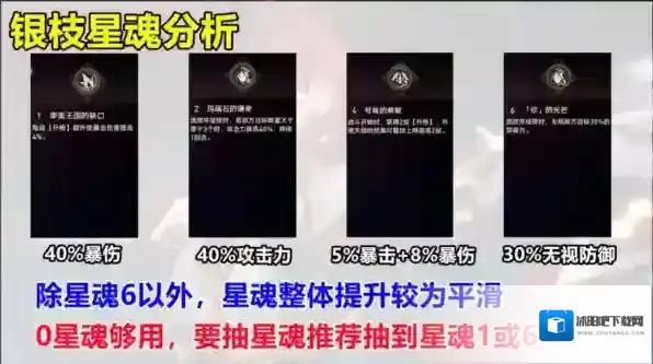 银枝的星魂基本都是简单直接的加伤害数值。星魂1最多总共可为银枝提供40%暴击伤害。星魂2则是40%攻击力加成。星魂4是再加两层天赋上限,相当于再多出5%暴击率和8%暴击伤害。星魂6则是终结技无视敌人30%防御力。总体来看,除了星魂6以外,其余星魂提升较为平滑,且都是数值方面的提升,不涉及机制或充能的变化。要抽星魂的话,推荐抽到星魂1或者星魂6;但对于一般玩家来说,0星魂的银枝就足够用了。