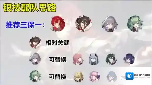 银枝的机制适合三保一配队,同时如果队友带充能和增伤的话更好。因此最推荐的配队为:银枝+停云+布洛妮娅+藿藿。相对来说,三个队友中最关键的是停云。布洛妮娅替代可选艾丝妲或者寒鸦提速,目的都是让银枝多出手加快充能;又或者选择加高额双暴攻击的驭空或群体减防的佩拉。藿藿替代可选罗刹或者符玄,再然后是同是物理属性加可以解控的娜塔莎,以及其他生存位也可以考虑。