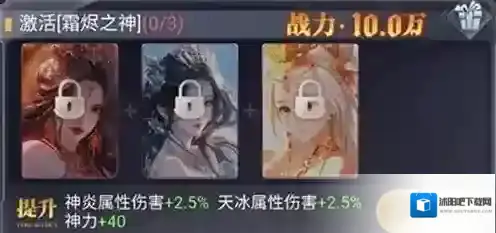 战力:100000、提升:神炎属性伤害+2.5%,天冰属性伤害+2.5%,神力+40。
