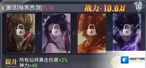 战力:100000、提升:所有仙将暴击伤害+2%,神力+40。
