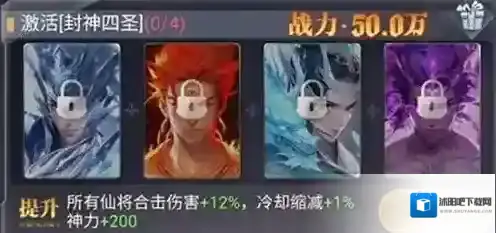 战力:500000、提升:所有仙将合击伤害+12%,冷却缩减+1%,神力+200。