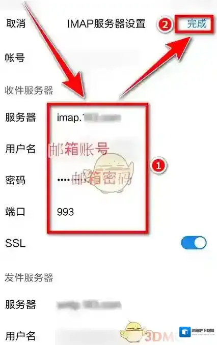 8、在收件服务器下面,输入刚才查询得到的IMAP服务器地址和端口,在用户名处填写邮箱账号,密码处输入“邮箱密码”,最后点击“完成”按钮即可。